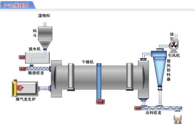 本烘干機(jī)采用順流式加熱方式。需要烘干的物料,從進(jìn)料端溜進(jìn)筒體,即被螺旋抄板推向后。由于烘干機(jī)傾斜放置,物料一方面在重力和回轉(zhuǎn)作用下流向后端,另一方面物料被抄板反復(fù)抄起,帶至上端再不斷地?fù)P撒下來(lái),使物料在筒內(nèi)形成均勻的幕簾,充分與筒內(nèi)的熱氣流進(jìn)行熱交換,由于物料反復(fù)揚(yáng)撒,所含的水分逐漸被烘干,從而達(dá)到烘干的目的。該物料適合于700度以下的烘干溫度。